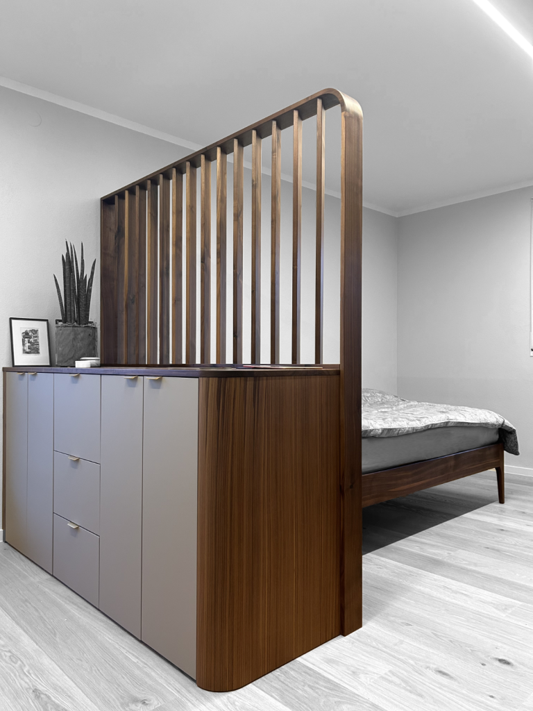 Für eine Kunden sollten wir ein neues Raumkonzept für das Schlafzimmer erstellen. Es wurde von uns mit einem eleganten Sideboard ausgestattet, das gleichzeitig als Raumteiler dient und ein angebautes Bett integriert. Um dem Raum eine leichte, luftige Atmosphäre zu verleihen, wurden sowohl das Sideboard als auch der Raumteiler mit sanften Rundungen versehen. Der Raumteiler selbst besteht aus schräg angeordneten Lamellen, die effektiv das störende Außenlicht abschirmen, ohne den Raum zu erdrücken.