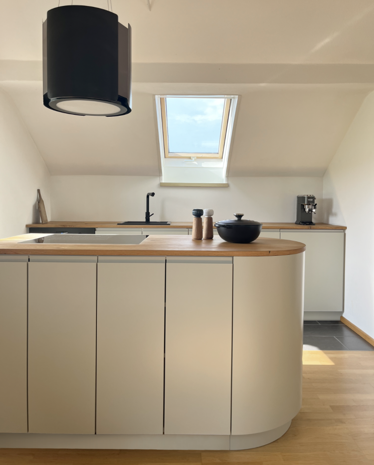 Für eine im Dachgeschoss gelegene Küche war es das Ziel, trotz ihrer Funktionalität ein wohnliches Ambiente zu schaffen. Klare Linien und ein sanfter Salbeiton verleihen ihr ein ruhiges Design. Unterstützt wird dies durch die filigrane Ausführung der Arbeitsplatte und die in die Fronten eingefrästen Griffnuten. Die lackierten Fronten stehen im Kontrast zu der geölten Massivholzplatte aus Eiche, die dem gesamten Raum eine warme Atmosphäre verleiht. Die rundgeformte Kochinsel sorgt für Leichtigkeit und ermöglicht optimale Arbeitsabläufe.