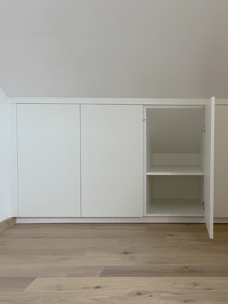 Für dieses Projekt haben wir einen maßgefertigten Dachschrägenschrank entwickelt, der den vorhandenen Raum unter der Schräge vollständig ausnutzt. Der Schrank wurde passgenau an die Geometrie des Raumes angepasst und bietet so praktischen Stauraum. Material und Oberfläche wurden auf den Bestand abgestimmt, sodass das Möbel optisch Teil der Wand wird.