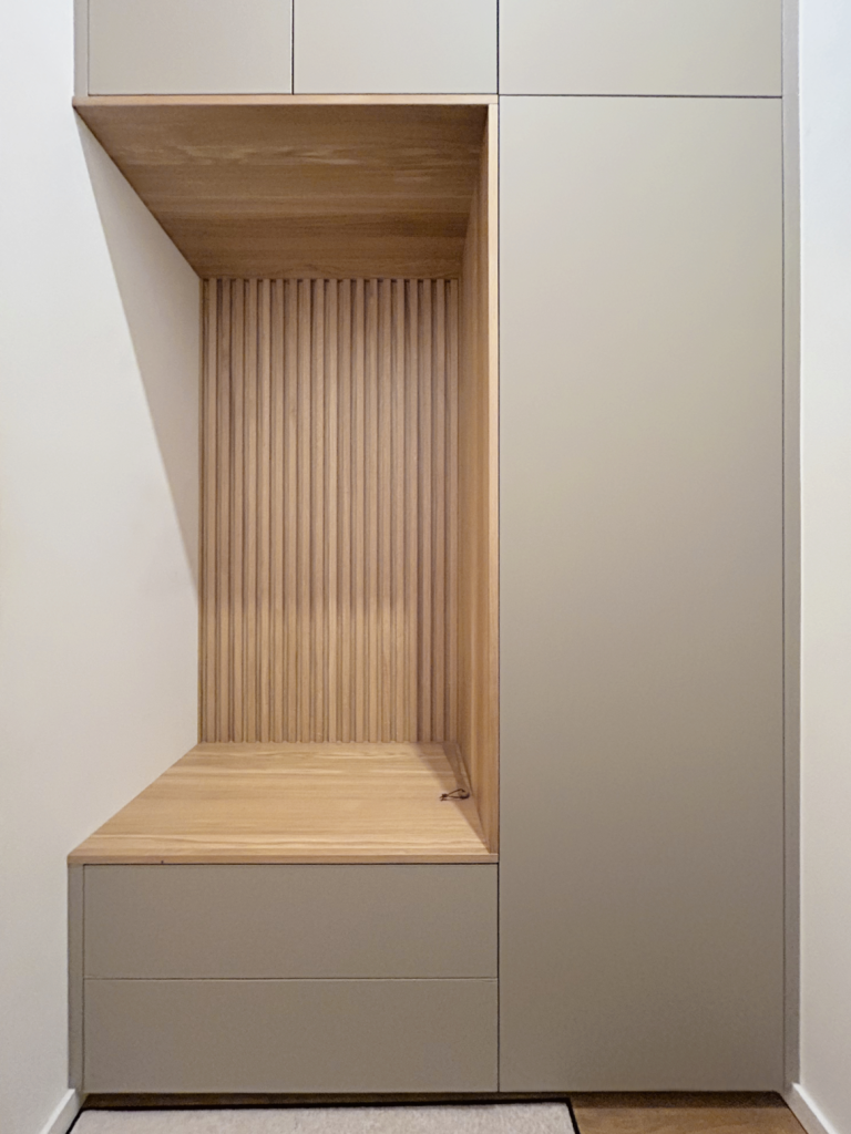 Die Garderobe verfügt über eine integrierte Sitzfläche mit Lamellenrückwand. Ergänzt wird sie durch maßgefertigte Holzhaken, die vom Kunden flexibel an den gewünschten Stellen zwischen den Lamellen montiert werden können. Unter der Sitzbank befinden sich zwei Schubladen. Weitere Stauraummöglichkeiten bieten mehrere Kleiderstangen, innenliegende Schubladen sowie Fächer in den oberen Schränken.