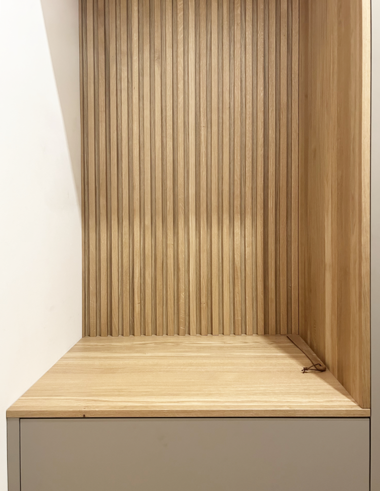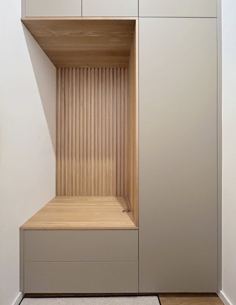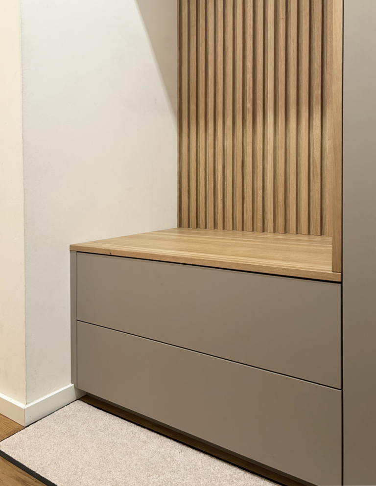 Die Garderobe verfügt über eine integrierte Sitzfläche mit Lamellenrückwand. Ergänzt wird sie durch maßgefertigte Holzhaken, die vom Kunden flexibel an den gewünschten Stellen zwischen den Lamellen montiert werden können. Unter der Sitzbank befinden sich zwei Schubladen. Weitere Stauraummöglichkeiten bieten mehrere Kleiderstangen, innenliegende Schubladen sowie Fächer in den oberen Schränken.