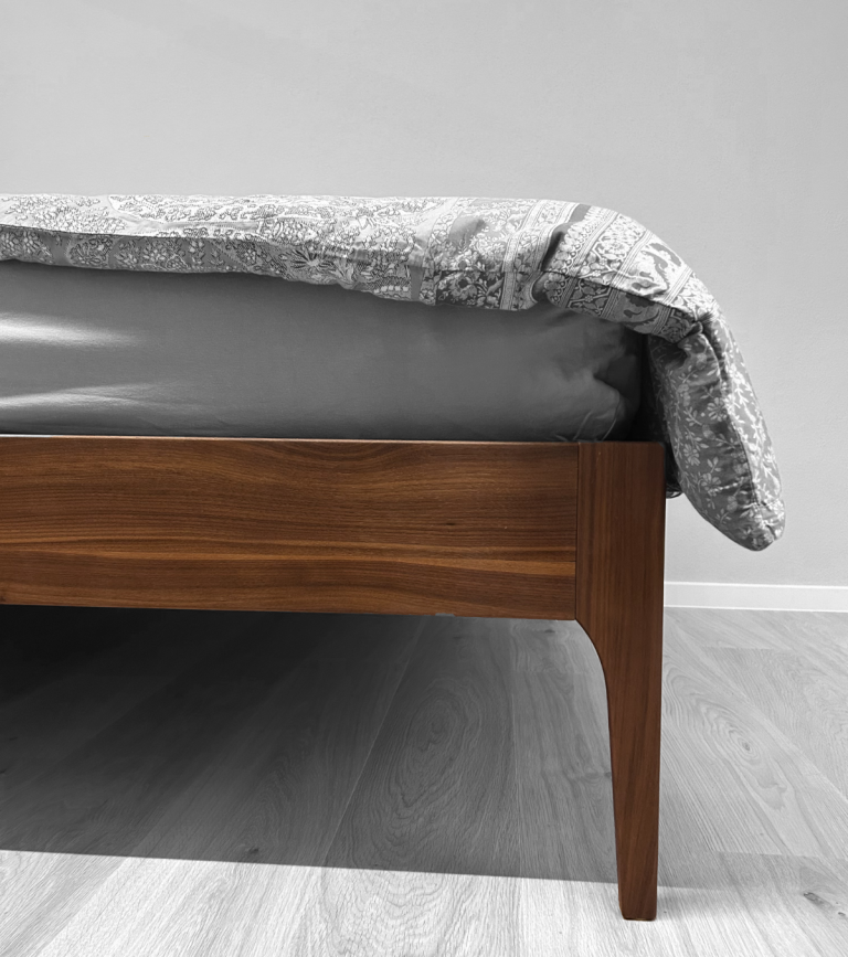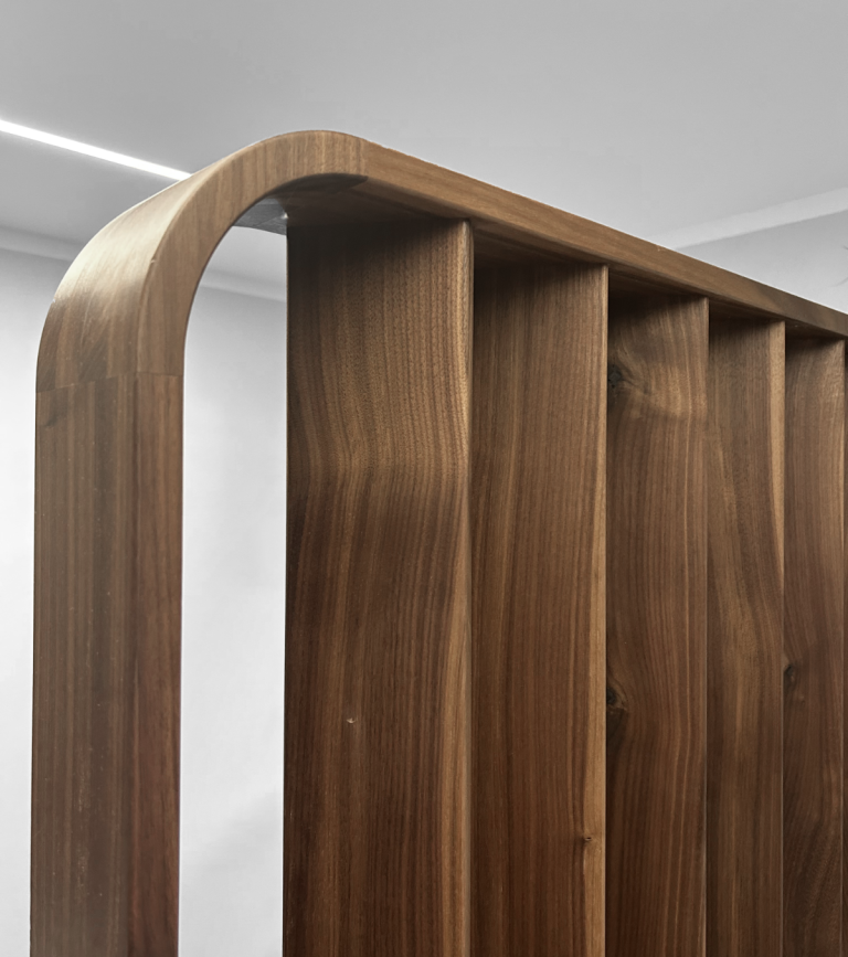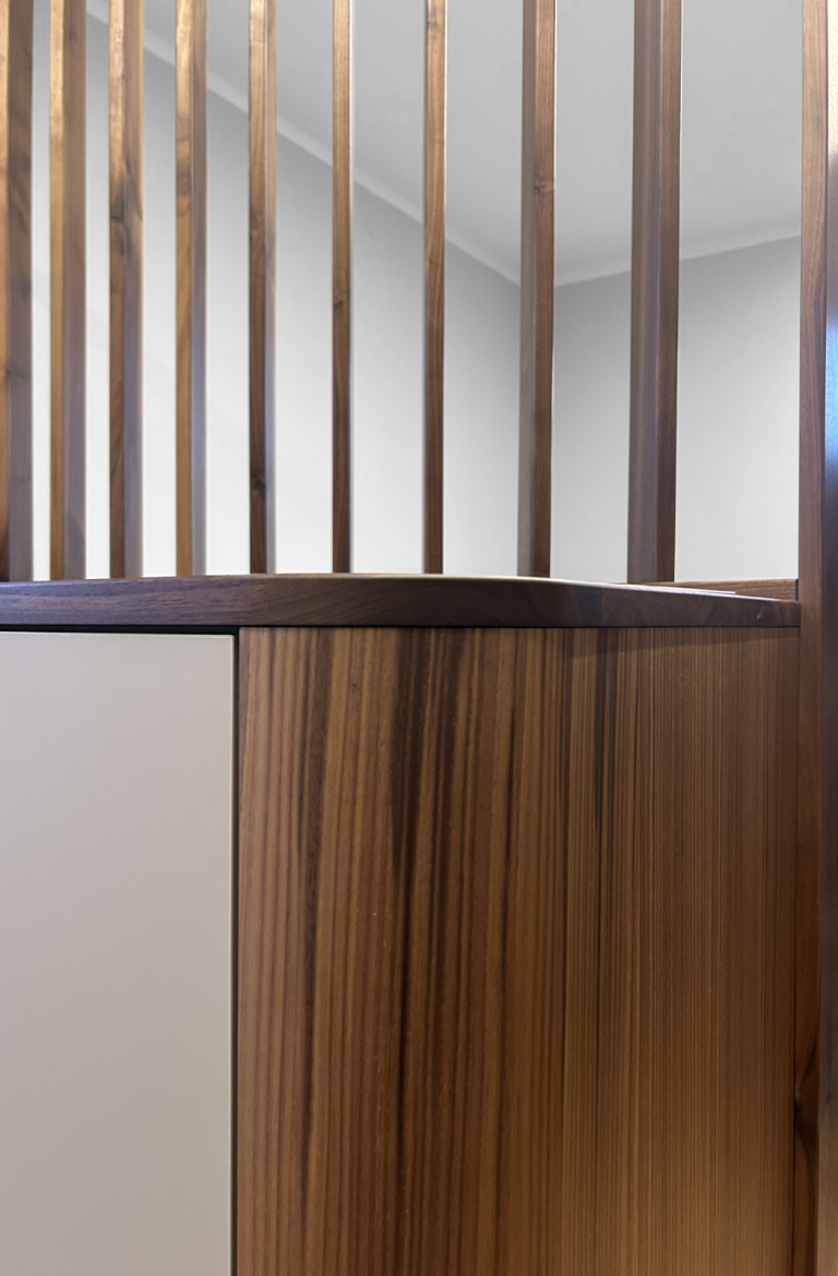 Für eine Kunden sollten wir ein neues Raumkonzept für das Schlafzimmer erstellen. Es wurde von uns mit einem eleganten Sideboard ausgestattet, das gleichzeitig als Raumteiler dient und ein angebautes Bett integriert. Um dem Raum eine leichte, luftige Atmosphäre zu verleihen, wurden sowohl das Sideboard als auch der Raumteiler mit sanften Rundungen versehen. Der Raumteiler selbst besteht aus schräg angeordneten Lamellen, die effektiv das störende Außenlicht abschirmen, ohne den Raum zu erdrücken. Für einen besonders edlen Look wurde bei der Materialwahl großer Wert auf Qualität gelegt: Amerikanischer Nussbaum in Kombination mit einem matten Fango-Ton sorgt für ein harmonisches und zugleich stilvolles Ambiente. Auf der gegenüberliegenden Seite des Raumes befindet sich ein Kleiderschrank, der im gleichen Design wie das Sideboard gefertigt wurde. Der Schrank bietet nicht nur ausreichend Stauraum für Kleidung, sondern auch Platz für Haushaltsgegenstände.